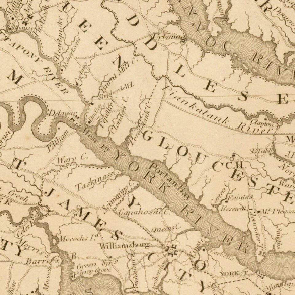 The present map is the lower left sheet of Bishop Madison's monumental 8 sheet work, and depicts the critical southwest section of the state, including all of Virginia's coastlines and the Chesapeake Bay estuaries of the Potomac, Rappahannock, York and James rivers. Also included are the state capital, Richmond, the old colonial capital, Williamsburg, and the key naval port of Norfolk. All roads, towns, and the locations of plantations (with their owner's names) are finely engraved. The copyright imprimatur, reading "Richmond Published 4th March 1807" is located to the upper right of the sheet.