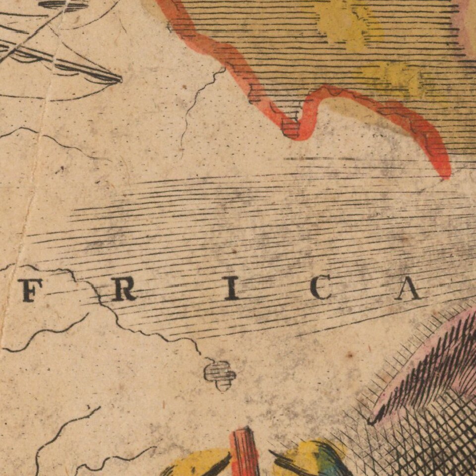 Includes an allegorical image of Atlas holding the World aloft, along with images of Triton, Mercury and a number of other gods, overlooking a projection of the Globe showing Africa and Europe.