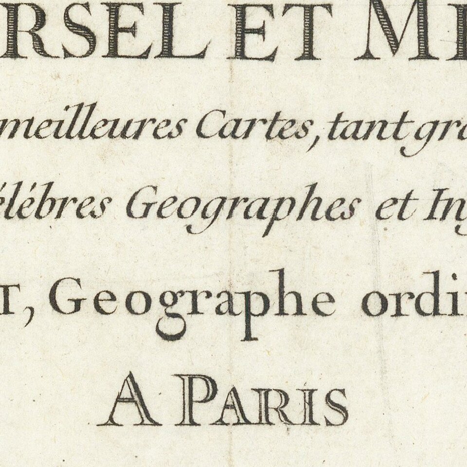 Didier Robert de Vaugondy (ca. 1723-1786) was the son of prominent geographer Gilles Robert de Vaugondy and Didier carried on his father’s impressive work. Together, they published their best-known work, the Atlas Universel (1757). The atlas took fifteen years to create and was released in a folio and ¾ folio edition; both are rare and highly sought-after today. Together and individually, father and son were known for their exactitude and depth of research.