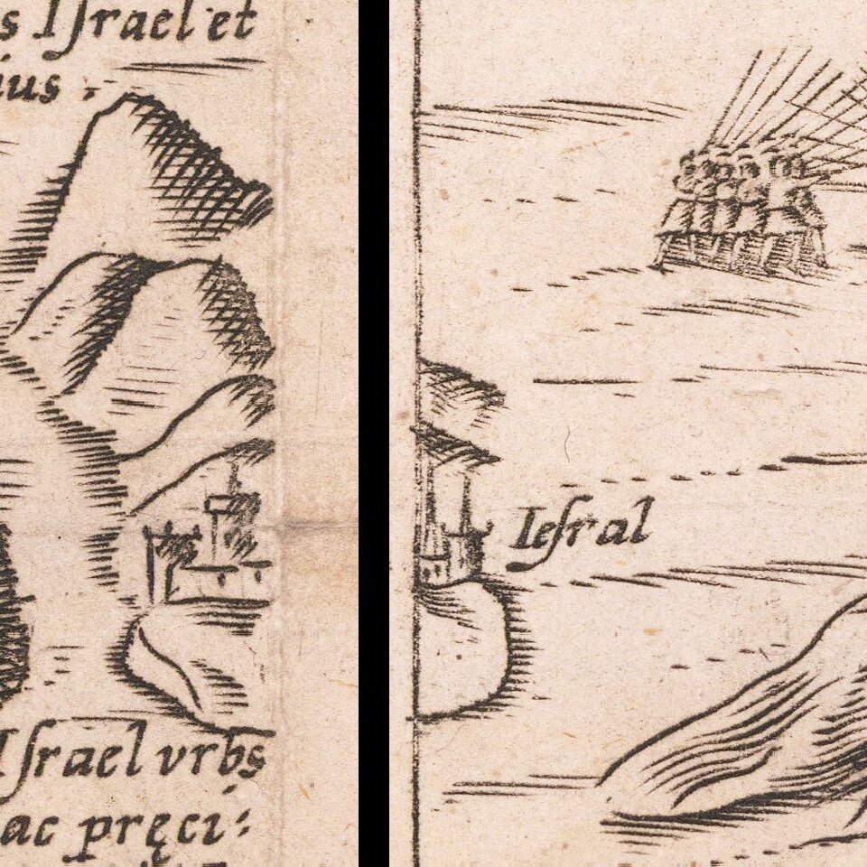 Although the title claims to be a true description, there are many errors in the location of the places. The important cities with the buildings are represented and the different episodes mentioned in the Bible are explained on the map. In the Dead Sea, the cities are shown as burning.