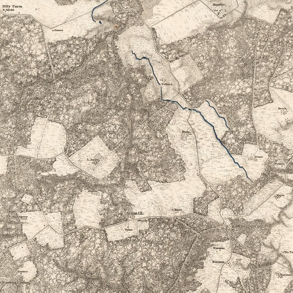 Highly detailed map of the area around Totopotomoy, Virginia, highlighting the battles fought in the area during the Civil War.