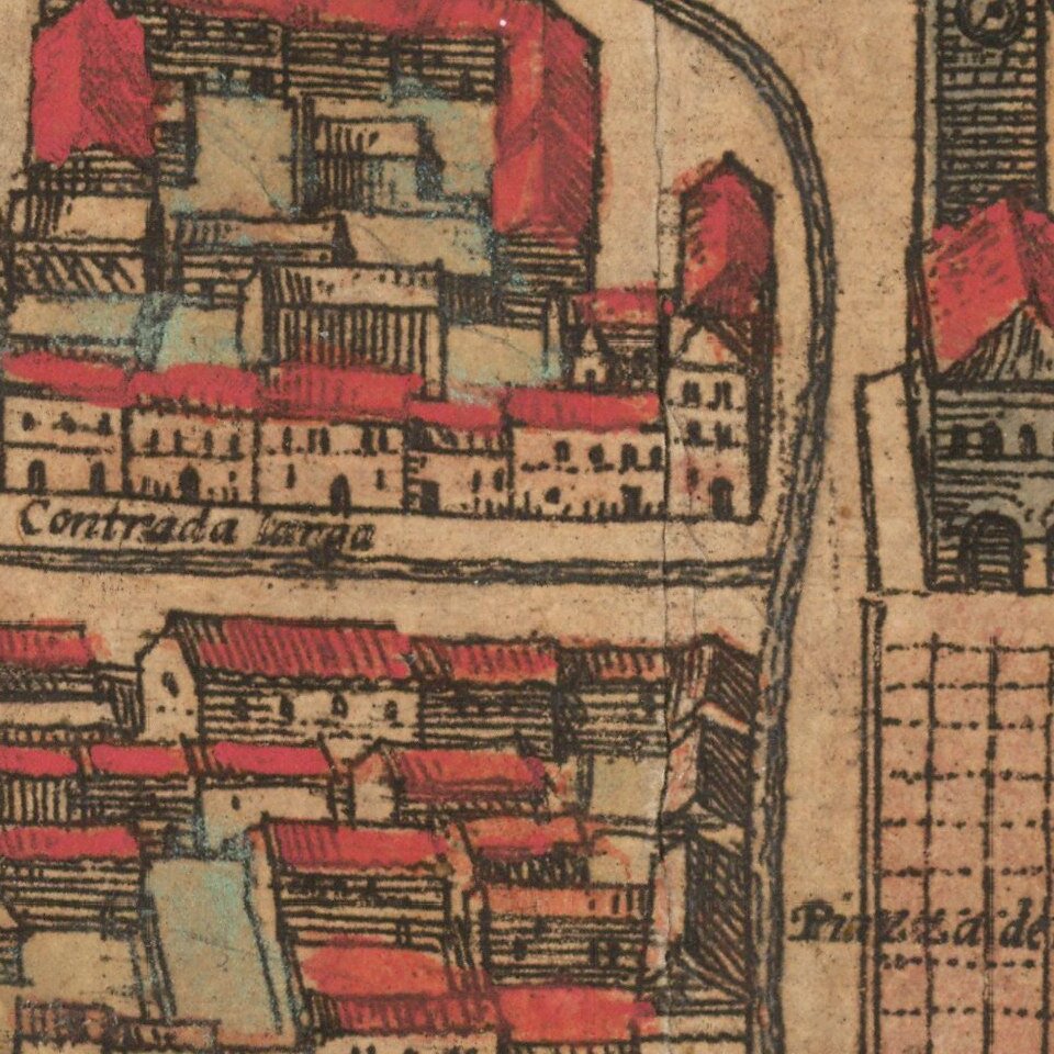 The bird's-eye plan shows Trento on the Adige with its surrounding fields. On the bend in the river lie the episcopal Castello del Buonconsiglio, with its massive round tower (left) and the Renaissance Magno Palazzo. The dominating Romanesque cathedral in the centre of the plate goes back to the early Christian church of the Holy Sepulchre of St Vigilius. Between the bishop's residence and the cathedral lies the small Gothic church of San Pietro.