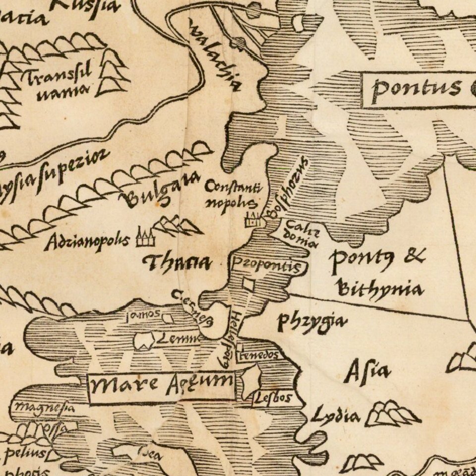 This fine early map depicts the gateway between Europe and Asia, including southeastern Europe, western Turkey, and extending to the Sea of Azov.