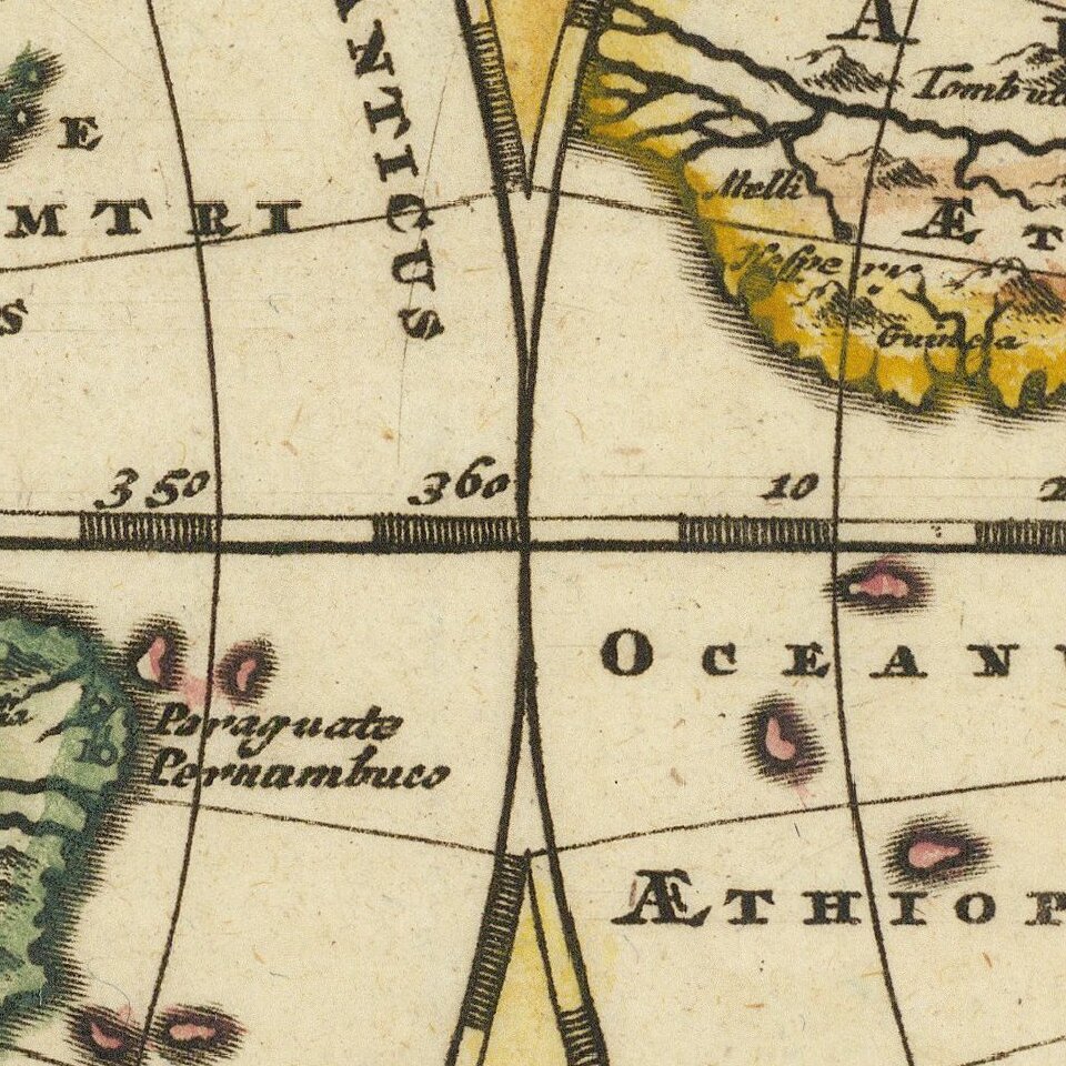 In the southern hemisphere, the mythical Terra Australis Incognita dominates the map, with a narrow passage below Java Major and unnamed New Guinea, giving hints of the discovery of the Australian continent. The interior of North America is little known, with no Great Lakes and only a modest depiction of the Mississippi River. The Rio Grande is flowing into the Gulf of California. The bulging depiction of the east coast of North America is reflective of the explorations in the first half of the 17th Century, with Florida, Virginia, Norembega (New England) identified. The depiction of South America remains oversized, with a curious mix of pre-Le Maire and post-Le Maire geography shown at the southern tip of the continent.