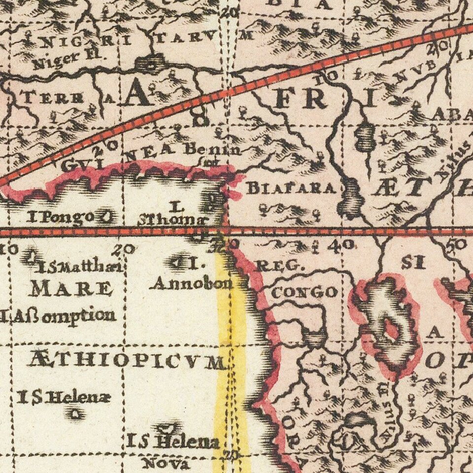 In Asia, the north of Japan is large and bulbous, labeled as “T. Iedso.” Iedso is a reference to Jesso, a feature included on many seventeenth and eighteenth-century maps. Historically, Eso (Yeco, Jesso, Yedso, Yesso) refers to the island of Hokkaido. It varies on maps from a small island to a near-continent sized mass that stretched from Asia to Alaska.