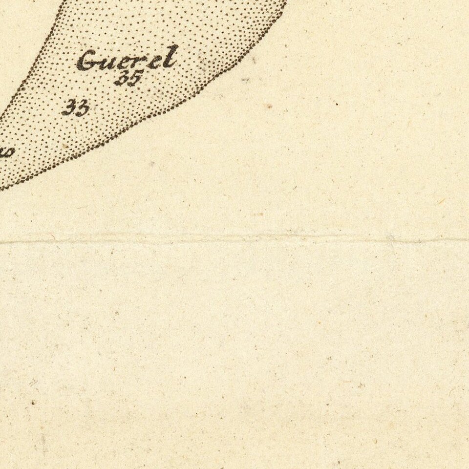 Cartographically, the map extends from Nova Scotia and Acadia to Newfoundland, the St. Lawrence Gulf and St. Lawrence River, along with the Grand Banks. This is the second state of the map, following a proof state, which lacks the trees and mountains.