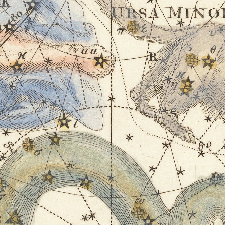 Striking star chart of Ursa Minor, Cassiopeia, Cephus and Draco, marvelously engraved and delicately colored. Shows the featured constellations in color with neighboring stars and constellations without color.