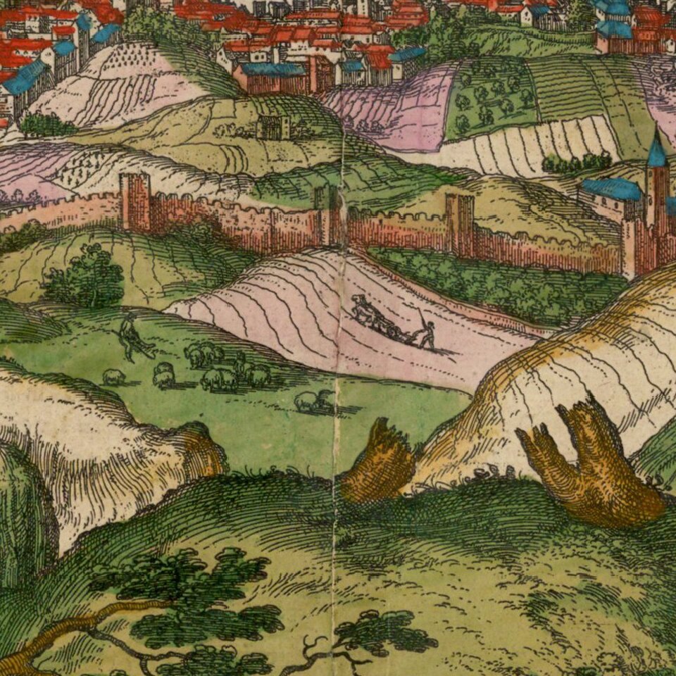 Georg Braun (1541-1622) was born and died in Cologne. His primary vocation was as Catholic cleric; he spent thirty-seven years as canon and dean at the church St. Maria ad Gradus, in Cologne. Braun was the chief editor of the Civitates orbis terrarum, the greatest book of town views ever published. His job entailed hiring artists, acquiring source material for the maps and views, and writing the text. In this role, he was assisted by Abraham Ortelius. Braun lived into his 80s, and he was the only member of the original team to witness the publication of the sixth volume in 1617.