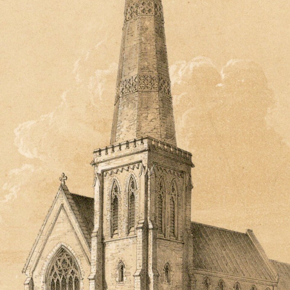 Rare early view of the proposed design for Trinity Church, as proposed by Architect Frank Gills, drawn by G.W. Burton and lithographed by Michelin in San Francisco.