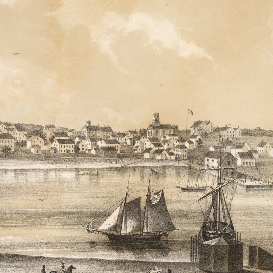 Bufford's view shows the town in 1856, as seen by the artist from the sandspit to the east that still separates the harbor from Lagoon Pond.