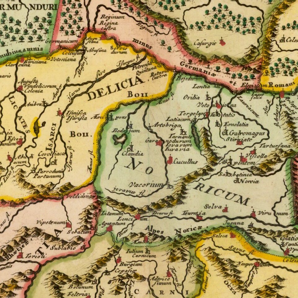 Decorative 18th Century Map of the region north of the Adriatic, from Cluver's Introductionis en Universum Geographicus…., one of the most prolific 17th and 18th Century Geography books.