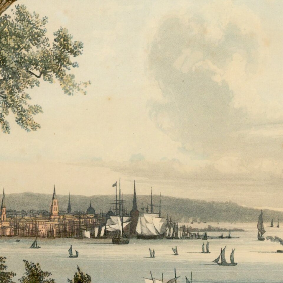 Rare first state of this finely executed aquatint view of New York City and Harbor as seen from Weehawken, New Jersey, based upon original artwork by Ambroise-Louis Garneray.