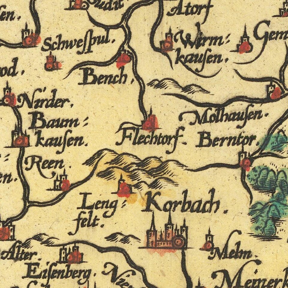 Nice example of Ortelius' regional map of the Waldeck region, with decorative cartouche, compass rose, etc.