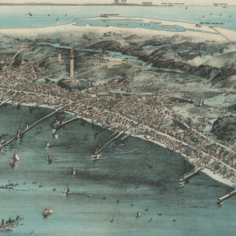 Looking in a northwesterly direction toward Cape Cod Bay and the distant Boston shoreline, this bird's eye view portrays Provincetown at a time when the town was transitioning from a community dependent on fishing to one whose economy and culture were increasingly tied to the annual influx of summer residents and a growing artists and writers community. The central focus of this view is Provincetowns most striking architectural feature the Pilgrim Monument. This 252-foot tower was completed just as the view was published in 1910. Celebrating this locale's historic origins, the monument was built to commemorate the Mayflowers five-week stay at the tip of Cape Cod before the Pilgrims decided to shift their base to Plymouth Bay. The view also provides evidence of the community's changing economy. Numerous wharves, a mixture of steam and sailing ships in the harbor, and three cold storage plants for processing fish (Consolidated Weir, Provincetown Cold Storage, and Fisherman's Cold Storage) reflect the towns reliance on maritime industries during the 19th century. On the other hand, the identification in the legend of several hotels (Pilgrim, New Central, Atlantic, Gifford, and Mt. Pleasant Houses) and the Star Theater foreshadows the town's developing tourist industry during the 20th century.The view was originally issued as a larger birds-eye view, with this reduced folding version issued in the same year.