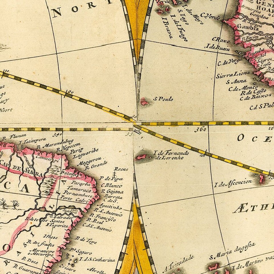 Rodney Shirley opined that Valck's world maps were based on Jaillot's influential Mappe-Monde of 1674, but in fact all three bear a much closer relationship to De Wit's map. The present map shares many of De Wit's cartographic elements, particularly in the polar projections; but there are also numerous differences, some partly explained by this Valck map being on a larger scale than the original De Wit map, allowing greater detail and decoration. For instance, the gap between the words 'America' and 'Meridio' in Brazil are now decoratively filled with a native village and a battle scene; in other areas, such as the outline of the coast of New Zealand, the toponyms are engraved quite differently. The north-eastern coastline of Asia in the present work also bears a closer resemblance to the 1666 world map of Jan van Loon (Shirley 439).
