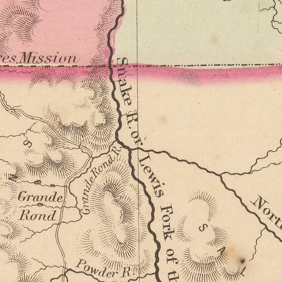 Rivers and mountains are shown in detail, including the Lewis and Clark Forks of the Columbia River. The former is also known as the Snake River, a part of the Oregon Trail famous for its rapids. The Oregon Trail was already past its heyday when this map was made, but the impact of the settlers that walked and drove that trail is evident here. Indigenous peoples are also acknowledged, however, with the names of tribes inscribed over the areas they inhabit.