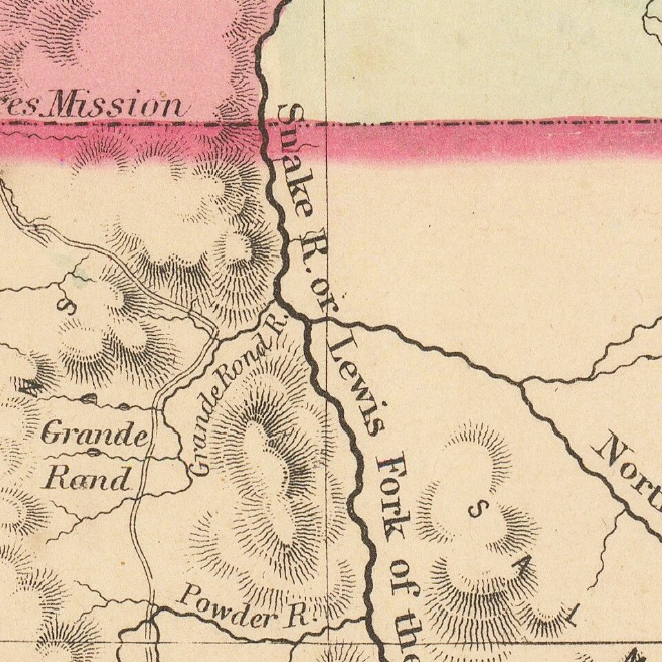 Rivers and mountains are shown in detail, including the Lewis and Clark Forks of the Columbia River. The former is also known as the Snake River, a part of the Oregon Trail famous for its rapids. The Oregon Trail was already past its heyday when this map was made, but the impact of the settlers that walked and drove that trail is evident here. Indigenous peoples are also acknowledged, however, with the names of tribes inscribed over the areas they inhabit.