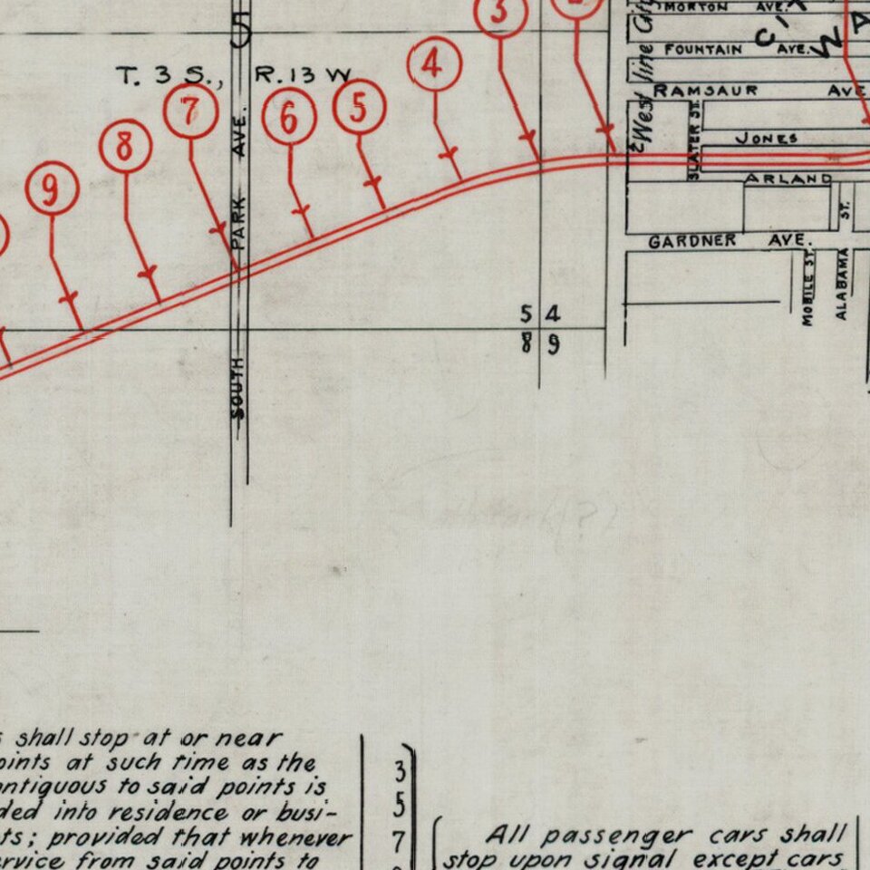 Detailed engineering map showing the various proposed stops on the Pacific Electric Railway line on the Watts-Homeward line, as prepared by the Pacific Electric Railway Company engineers.