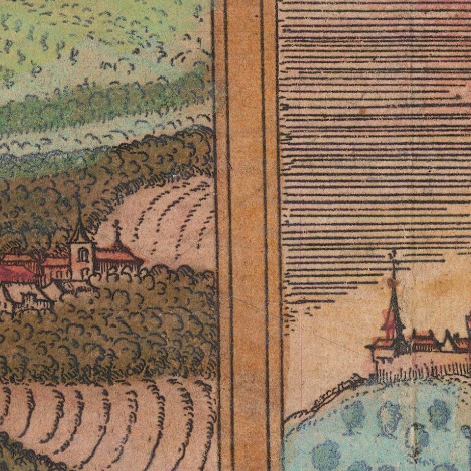 Georg Braun (1541-1622) was born and died in Cologne. His primary vocation was as Catholic cleric; he spent thirty-seven years as canon and dean at the church St. Maria ad Gradus, in Cologne. Braun was the chief editor of the Civitates orbis terrarum, the greatest book of town views ever published. His job entailed hiring artists, acquiring source material for the maps and views, and writing the text. In this role, he was assisted by Abraham Ortelius. Braun lived into his 80s, and he was the only member of the original team to witness the publication of the sixth volume in 1617.