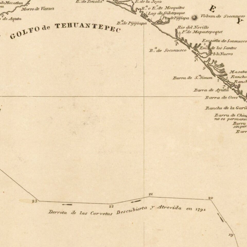 This fine chart depicts the length of the Pacific Coast of North and Central America, from the Gulf of Dulce in Costa Rica up to San Francisco Bay, California. The main section of the chart shows the coast from Costa Rica up to the port of San Blas, Nayarit, Mexico. In the latter 18th-century, San Blas was importantly the base for Spanish Pacific explorers. Indeed, the tracks of Captain Alejandro Malaspina's 1791 southward voyage, commanding the Descubierto and the Atrevida, is delineated on the map. The large inset to the left features the coastline from San Blas northwards to include San Francisco Bay.