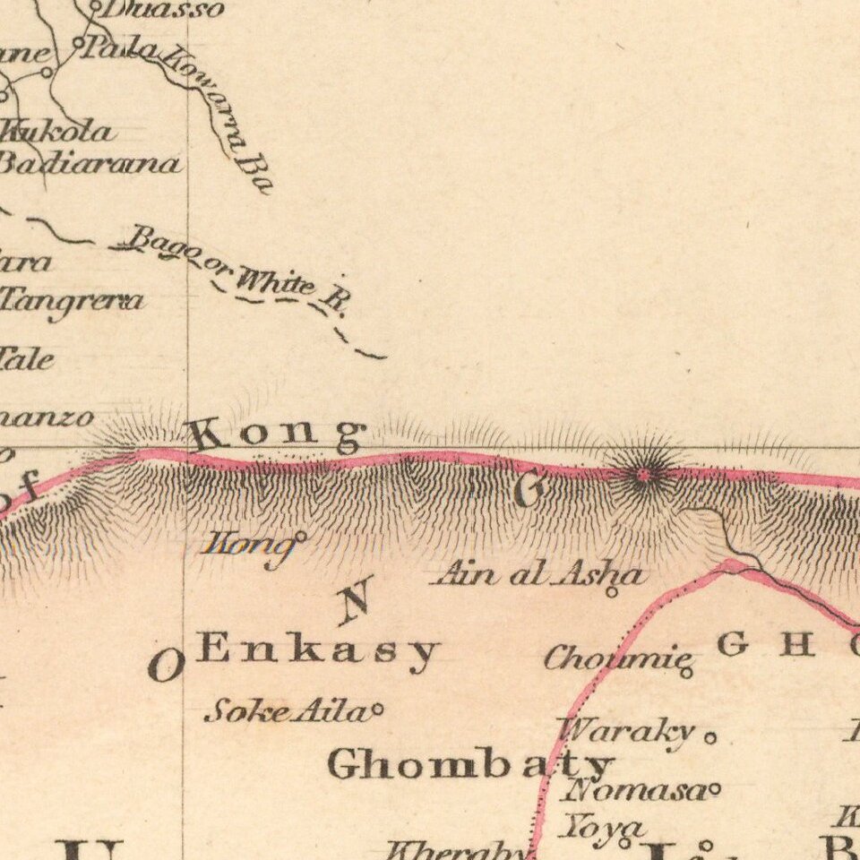 Decorative map of Western Africa, showing towns, roads, rivers, lakes, mountains, etc.