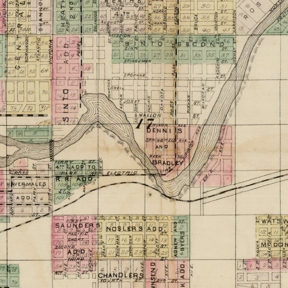 The map was published for Strobach and Munter, Real Estate Agents, in the year after Spokane's great fire destroyed a significant part of the town. Includes the location of major subdivisions, the railroad lines and vignette of Spokane Falls.