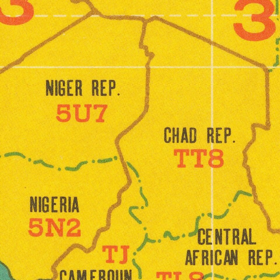 This is a map of the world produced for amateur radio operators, made by the Japanese Trio Kenwood (now Kenwood) Corporation. The map shows political boundaries, time zones, intriguing transportation devices, and, of course, useful information for amateur radio operators. Country codes are shown for each country or region in red letters alongside more specific black regional identification numbers in the largest countries. The ITU zones of the world, as they stood at the time, are shown in red numbering. ITU zones are used to manage the global radio spectrum and are subject to much scrutiny, criticism, and debate as to their exact borders.