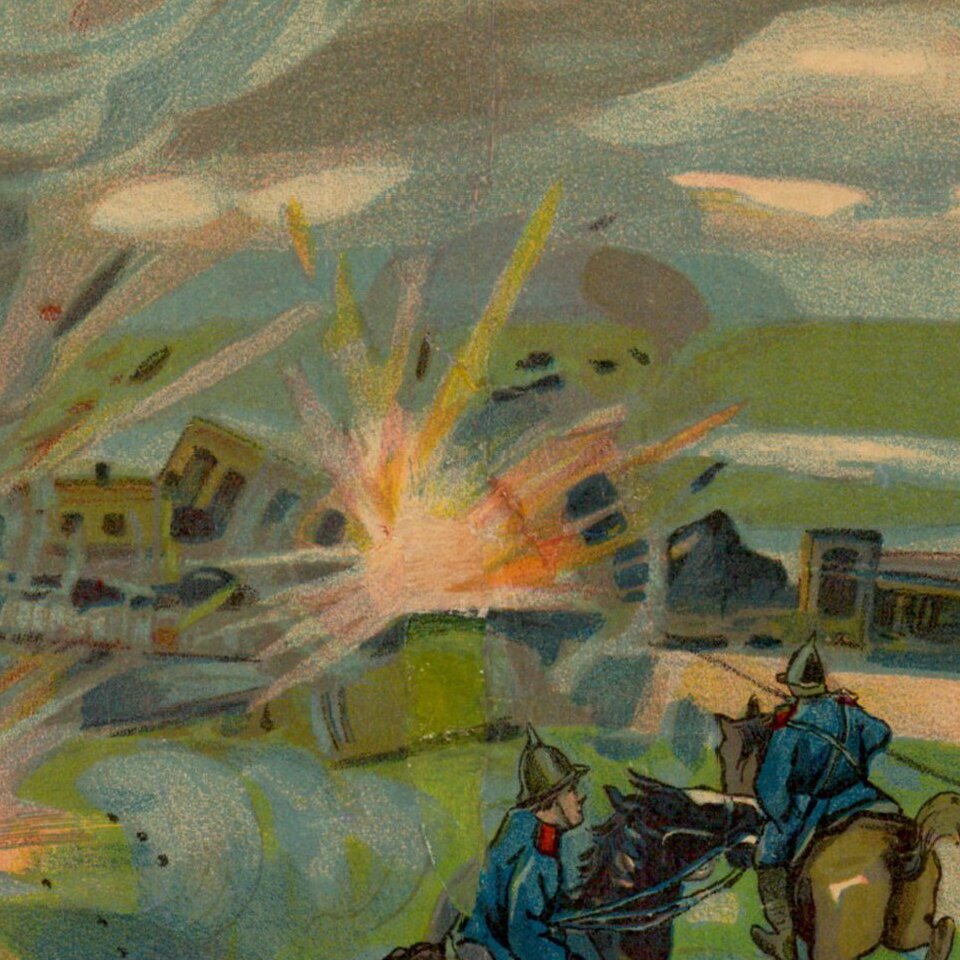 This amazing Russian WWI broadside shows the French fighter ace Adolphe Célestin Pégoud, known simply as "Pegu" to most Russians, mounting a successful aerial attack from his biplane against a German military rail convoy, with wounded German troops in the foreground. The gory but vibrant scene was meant to be part of a popular propaganda campaign celebrating the victories and feats of Russians and their English and French allies in their epic contest against the Germans, Austrians and Turks.
