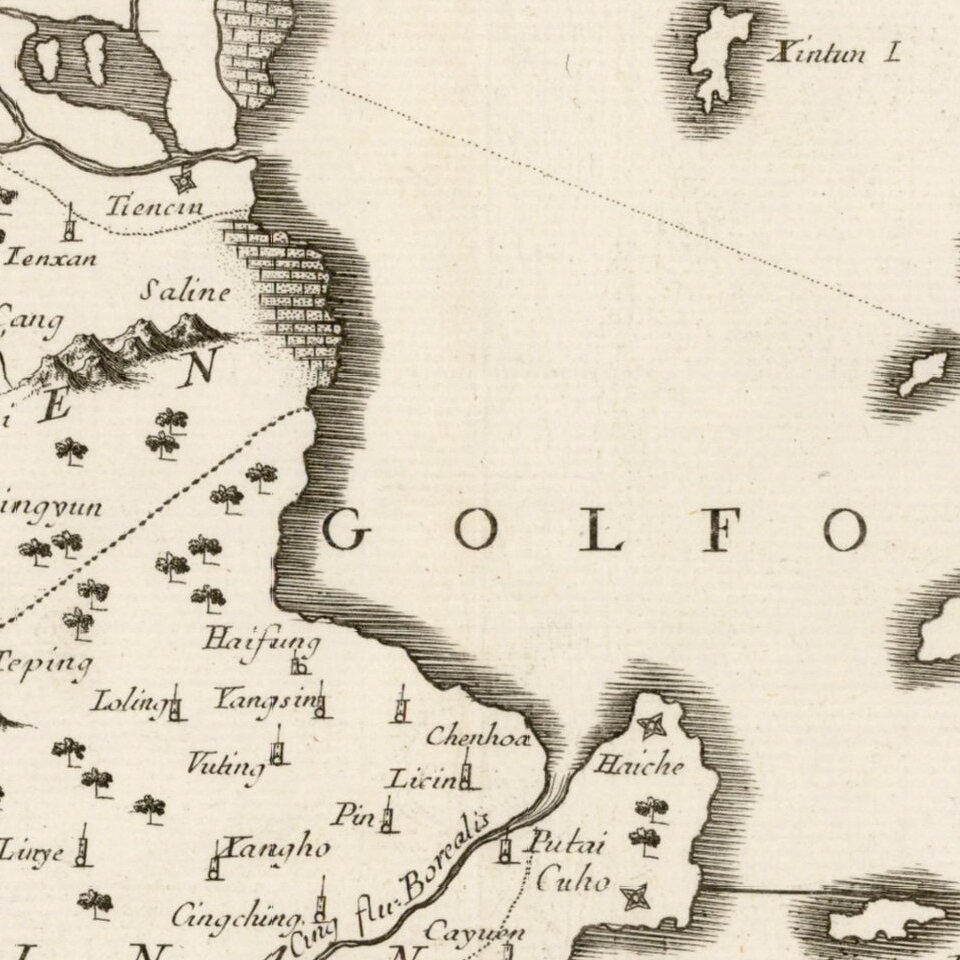 Fine example of Coronelli's map of the provinces of Shantung and Peking, from Coronelli's rare Corso Geografico Universale, one of the most decorative and ornate of the 17th century.