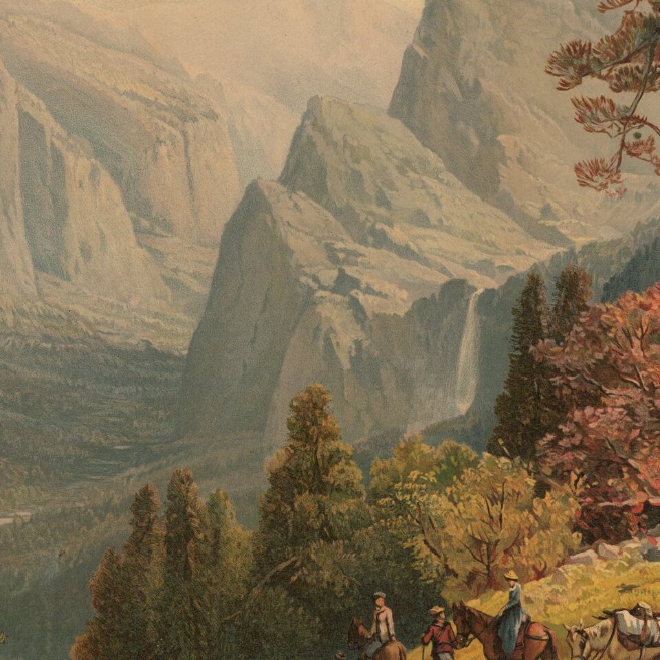 Fine large chromolithographic view of Yosemite Valley, looking from the Mariposa Trail in the Southwest corner of the valley toward El Capitan, the Three Brothers and Bridal Veil Falls.