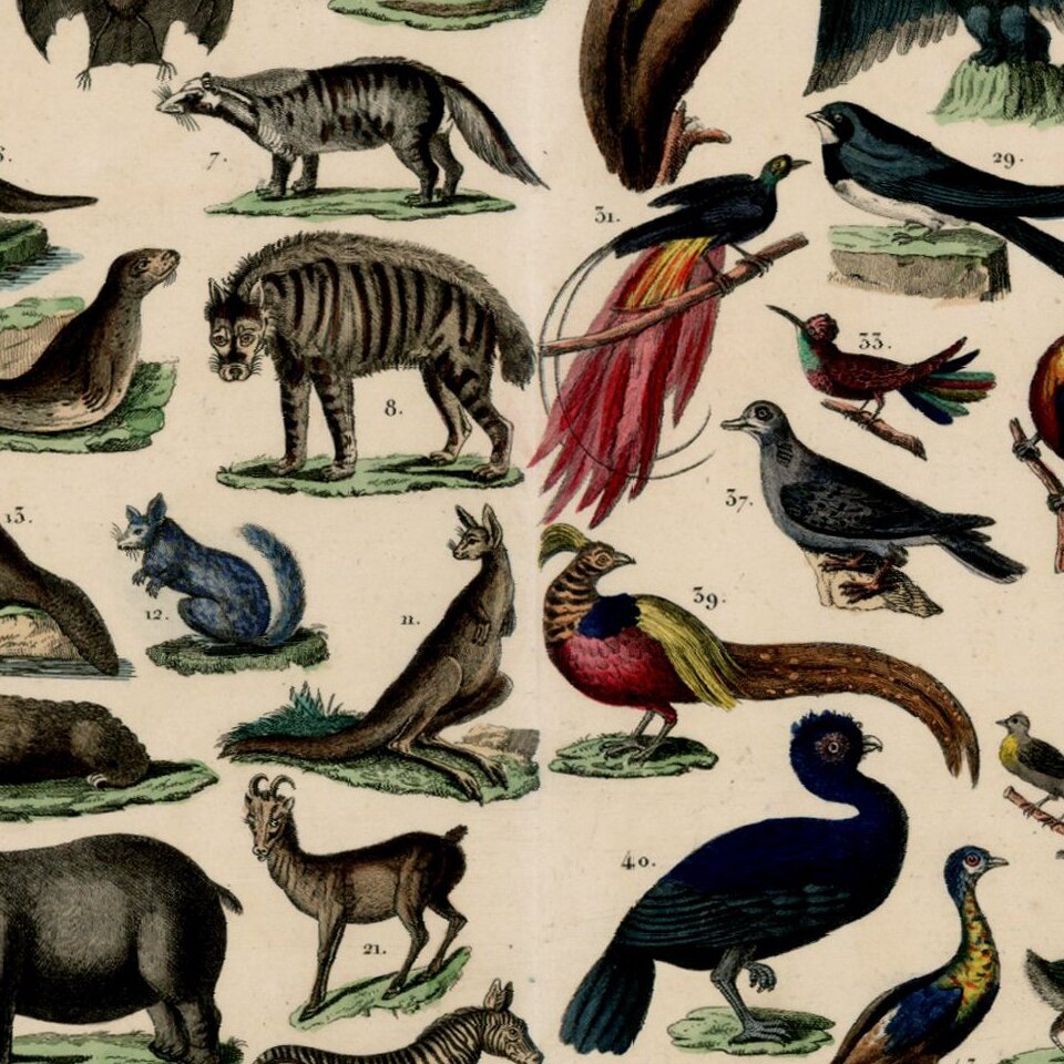 Gorgeous amalgam of mammals and birds, 50 in all, delicately hand colored. A rare and interesting plate of thick strong paper, with wide margins. First example we have ever seen!