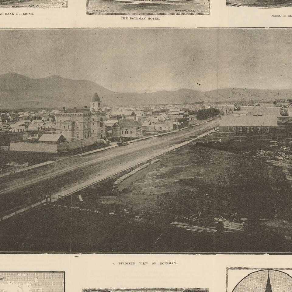 Very rare promotional work, illustrated with a photographic view of Bozeman, Montana, surrounded by 14 views showing buildings, street scenes and other illustrations of contemporary life.
