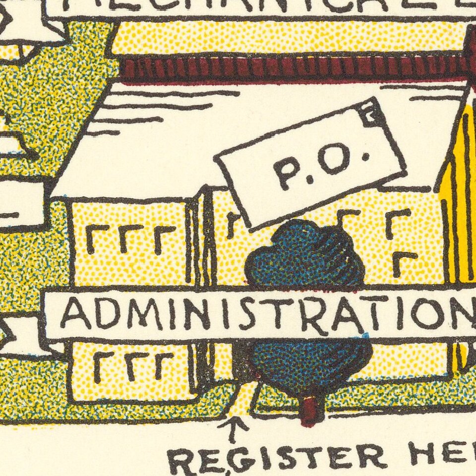 1947 ca. A Cartograph of the University of Minnesota drawn from the stratosphere directly above the river bank on three successive mornings - revealing much of the art of higher education! (18.5 x 18.5 inches)