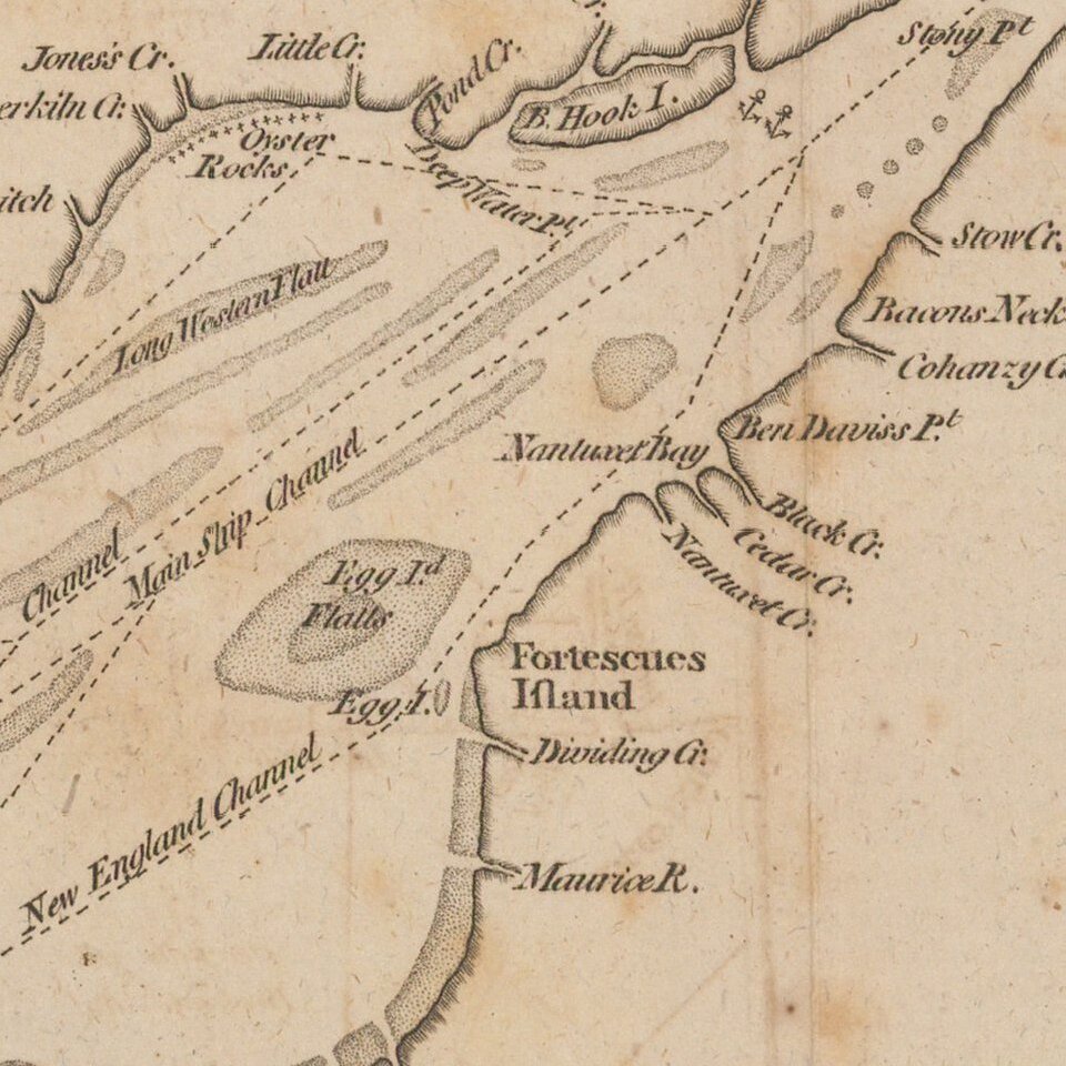 Also names many early Creeks, Rivers, Islands, etc., including, Rehoboth Bay, Lewis, Pilot, Draper's Inlet, Clark's Ditch, Thorofare, Reedy Island & Point, Newcastle, Wilmington, Marcus Hook, Chester, Mud Island, Salem, Bacons Neck, Ben Daviss Pt., Nantuxet Bay, Egg Island, Fortescues Island and the various shipping channels.