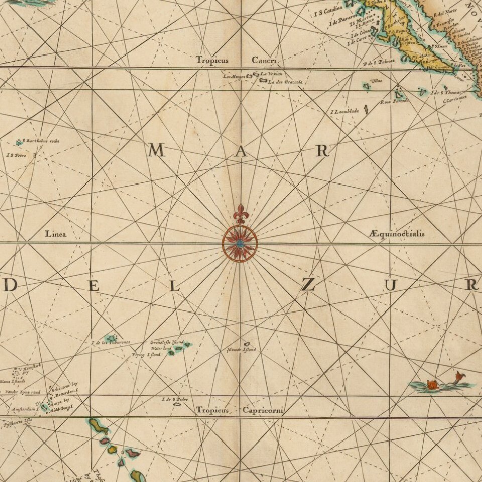 While Seller was known to have based some of his work on Goos, this map appears to loosely derive from Jansson's map of 1650, although many features (California, Companies Land, Tierra Del Fuego) are substantially updated and revised, and Jansson had no coverage of the Gulf Coast or East Coast, making the map unique in its coverage.