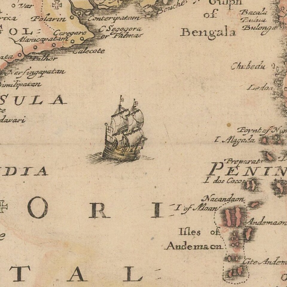 The map demonstrates the naïve engraving style characteristic of 17th Century English engravers, and features an elaborate heraldic cartouche, and a dedication to the Governor Deputy and Court Committees of the Company Merchants, trading into the East Indies.