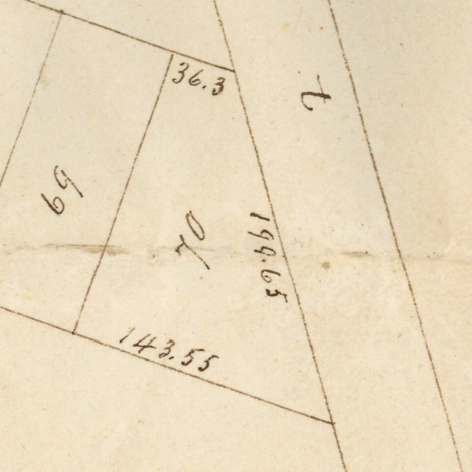 The [present manuscript] map is delineated on a scale of 10 perches to an inch embracing approximately one square mile and most likely corresponds with Lot No.1 as shown on Dewitt’s 1795 manuscript “Map of the Cayuga Reservation Surveyed Into Lots”, being the northernmost limit of the Reservation as situated south of the Seneca River. Topography along the river and streams is denoted by hachure as are the river, canal and several mill races. “Lot No. 6” is subdivided into 70 parcels being arranged in an ”L” shape where the improved road of Bayard Street, Seneca Turnpike Road and an unnamed lane connecting Bayard and Seneca Turnpike are shown. Improvements include a Grist Mill, Mill House, Cooper’s Shop and Oil Mill along with two plank bridges crossing the canal and river with a third downstream of the Grist Mill crossing the river independently. Three parcels east of Bayard Street bear the names Freeman & Bascom being Ansel Bascom and Asher Tyler. The whole of Lot No 6 is bounded on the east, south and west side by perpendicular double rule lines and on the north by the Seneca River. On an interesting historic note, the Seneca Turnpike Road here dissolves at the bank of the Seneca River bank and would not bridge the river until after completion of the middle section of the Erie Canal (1825) which is oddly absent here. The Erie Canal effectively paralleled the Seneca Turnpike through Cayuga County and should meet the river at the same general location. An Explanation under the title provides additional survey information, of which Note 7 is particularly interesting stating Quarry Reservation 12 Rods Wide which we surmise to refer to the Erie Canal diggings themselves or the extraction of limestone to support canal construction. This 12 rod wide reservation is clearly denoted on the map by ruled dimension lines and hachure.