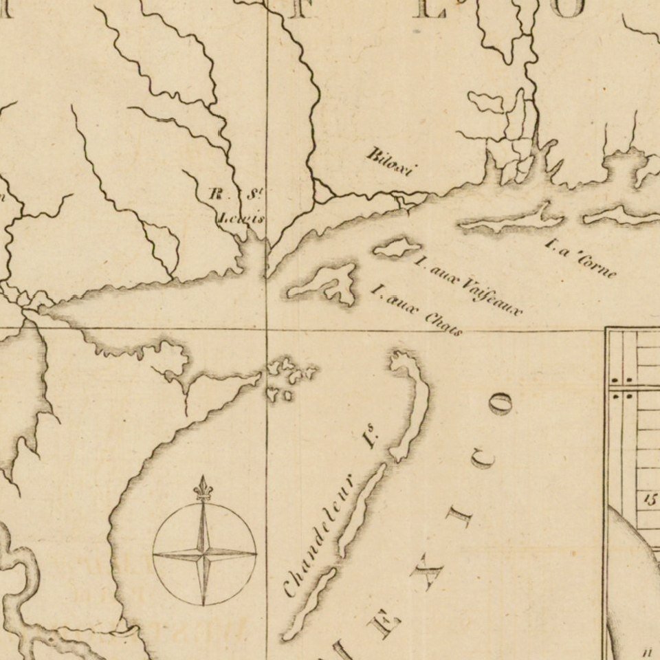 Extends to west of New Orleans to include Plantations along the Iberville at its confluence with Mississippi. Also names Biloxi and a number of islands, rivers, etc.
