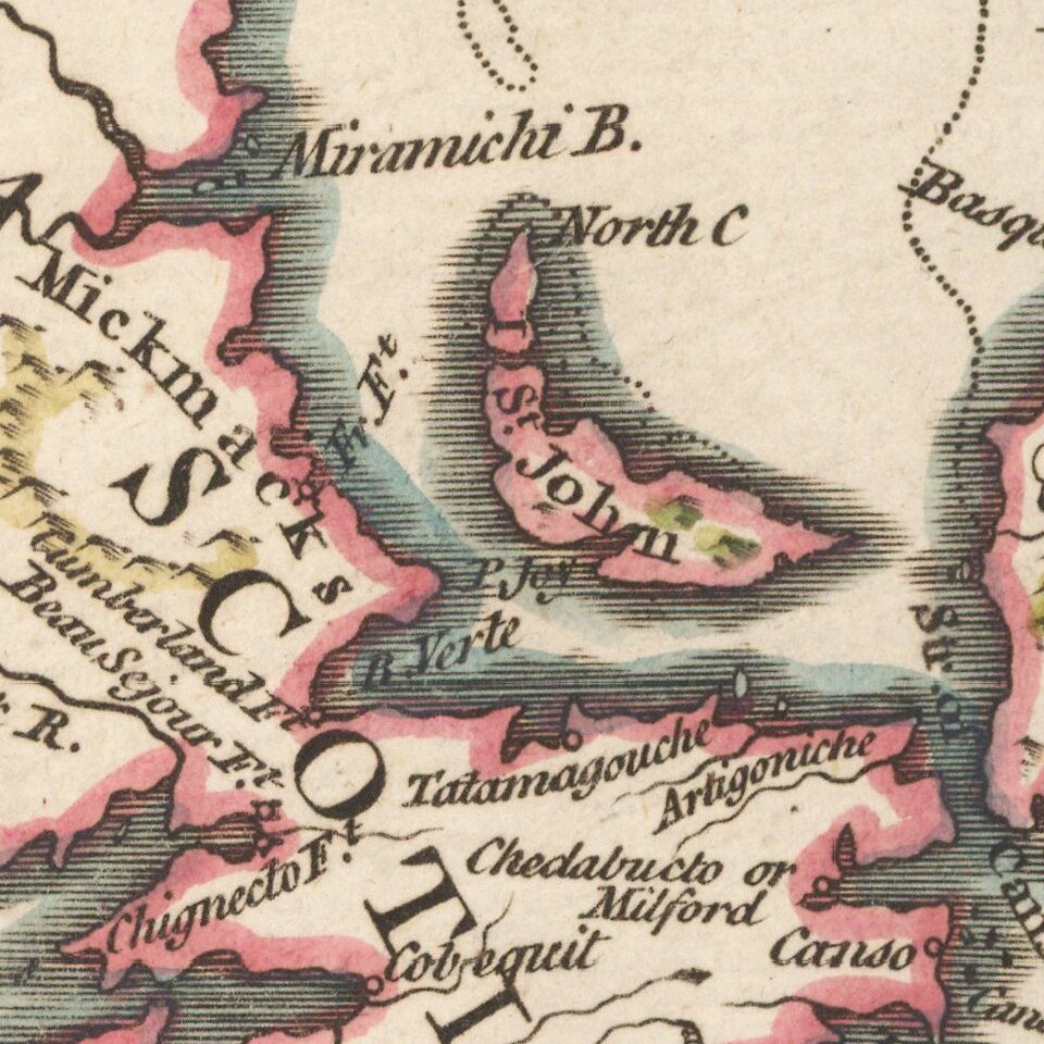 Detailed early map of the British & French Colonies in North America, extending from Long Island and the Hudson River to the St. Lawrence, Newfoundland and contiguous parts of Labrador, centered on Nova Scotia.