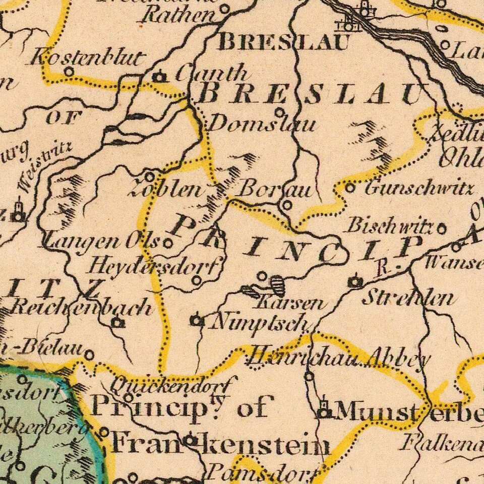 Includes Principalities of Glogau, Wolau, Lignitz, Oels, Breslau, Javer, Schweidnitz, Brieg, Oppeln, Neysze Trahenberg Sagan, Carolath, Franckenstein, Ratibor, Leobshutz, Troppau, Teishen etc. Shows towns, rivers, mountains, lakes, etc. Very detailed.