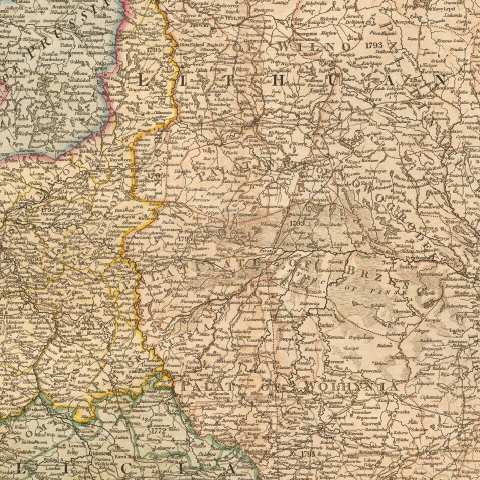 This map was originally published with a different title by William Faden in 1799. The map is based on the Rizzi-Zannoni 24-sheet map of 1772 that was commissioned by the King of Poland. An inset contains a bird's-eye plan of Warsaw flanked by tables of information concerning the population, religion, and languages.