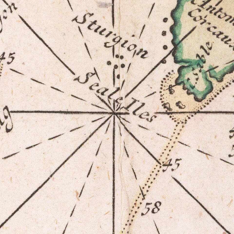 The second noteworthy difference is the additional detail and source material employed by Thornton. Thornton's chart includes significantly more detail, as well as information not previously shown on any other printed map, including the first appearance of Portland, Dover, Buzzard's Bay and Stoneing [Stonington], on a printed map. Burden notes: