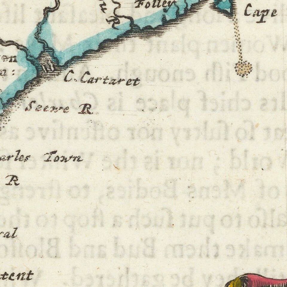 The map is a reduced version of Thornton, Morden & Lea's A New Map of Carolina, published in 1685, with one significant change, the Camabh and May Rivers do not intersect inland. The map covers the region from the May River and Colleton County to the Outer Banks and Albermarle County, centered on Cape Fear. Scots Settlement, Charles Town, Charles Towne, Port Royal, Barkin County, Craven County, Clarendon County, Albermarle County and Colleton County are all named, as are the Appalachians. The Tar-Pamlico (Pantegoe) River appears. Lederer's Savana and Lake Apalachia are no longer shown.