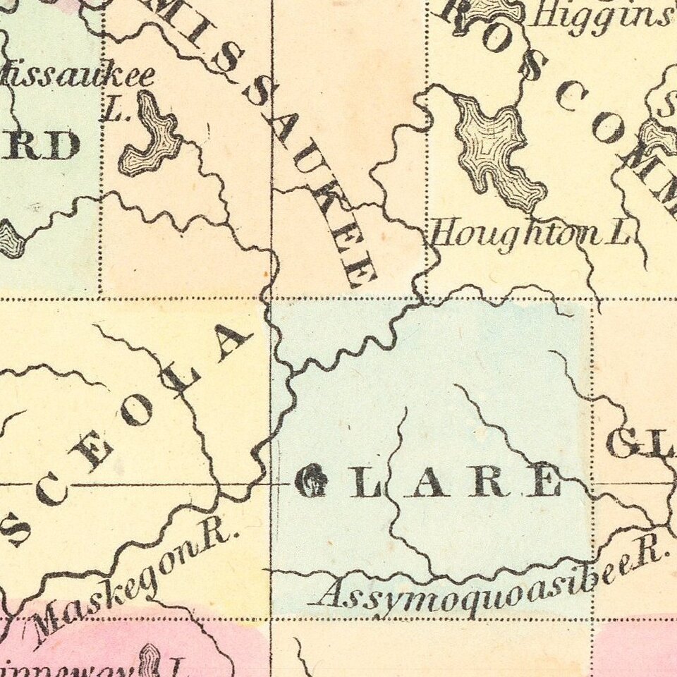 A number of Michigan Counties still not yet formed. Railroads are shown in Red and Canals in Blue