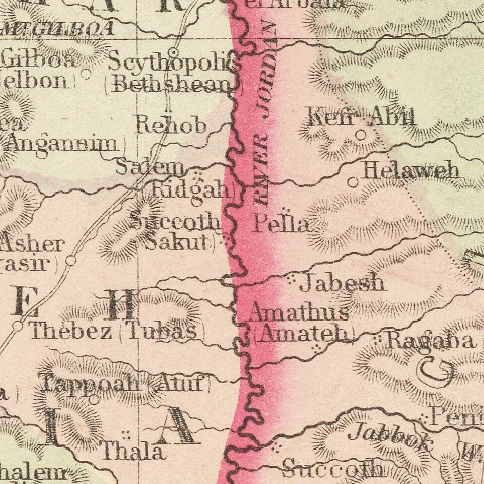 Interesting map of the Holy Land, hand colored by the 13 tribes, with an inset of modern Jerusalem.