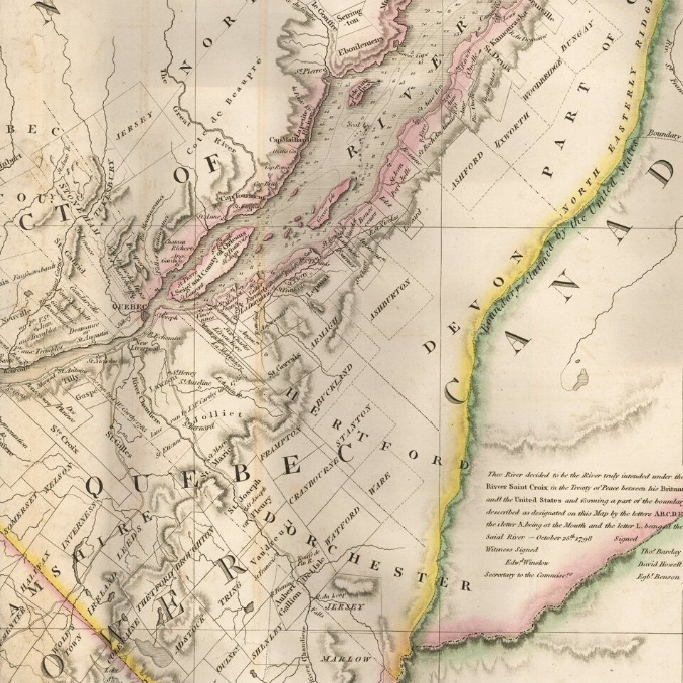 The original Faden map included information concerning over 100 land grants on either side of the St. Lawrence River, including the names of land owners. Faden's orginal map showed the surveys conducted in 1796-98 along the Scoudiac and Magaguadavic Rivers, in order to ascertain the true location of the St. Croix River. In the present map, there is significant new information and topographical details, showing the remarkable advancement in the surveying of the region in the 12 years after the publication of Faden's map of 1813.