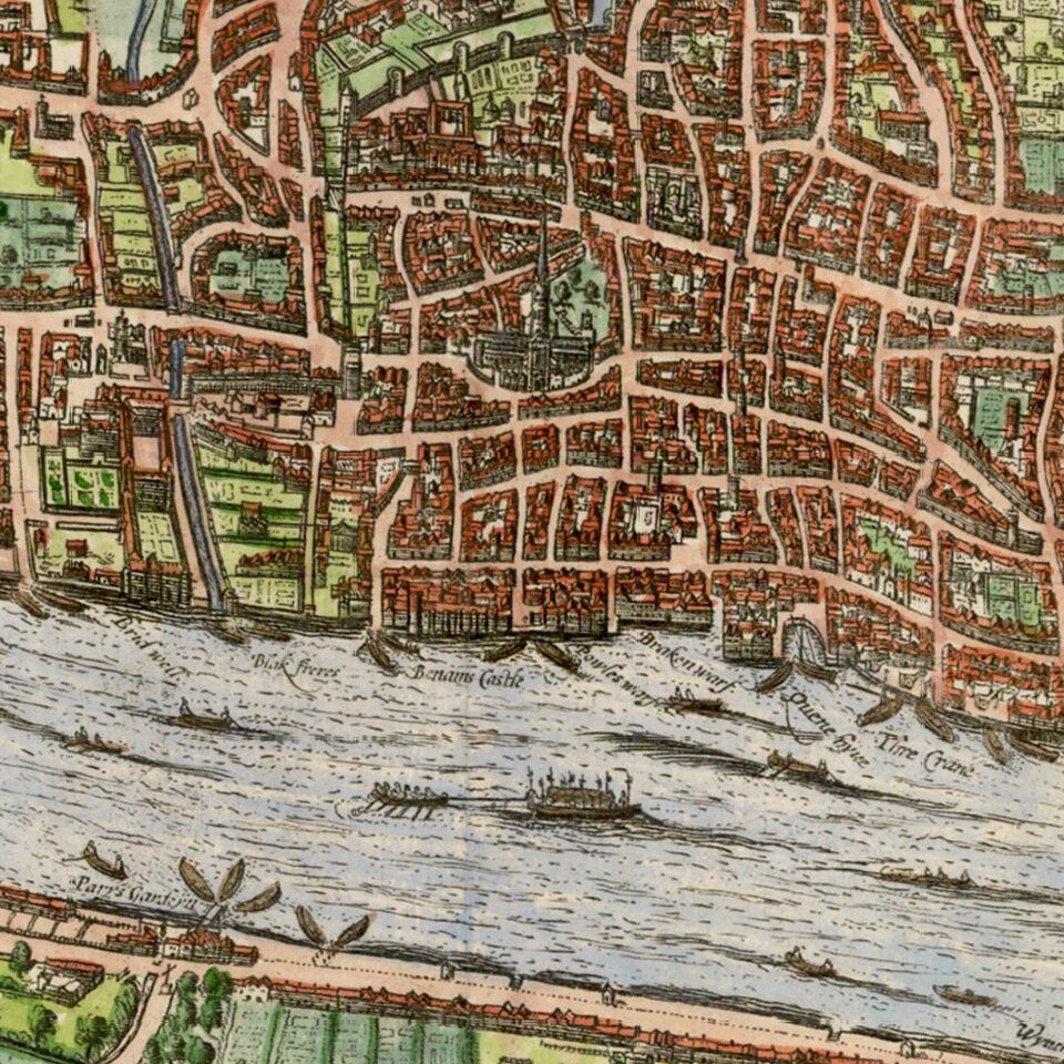 Fine full color example of the Edward Hatton edition of Braun & Hogenberg's view of London, first published in 1572.