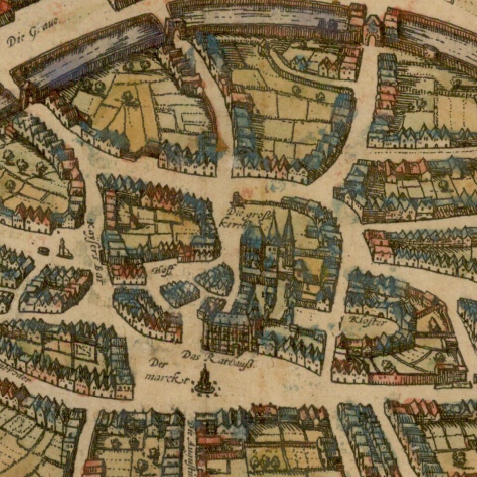 Georg Braun (1541-1622) was born and died in Cologne. His primary vocation was as Catholic cleric; he spent thirty-seven years as canon and dean at the church St. Maria ad Gradus, in Cologne. Braun was the chief editor of the Civitates orbis terrarum, the greatest book of town views ever published. His job entailed hiring artists, acquiring source material for the maps and views, and writing the text. In this role, he was assisted by Abraham Ortelius. Braun lived into his 80s, and he was the only member of the original team to witness the publication of the sixth volume in 1617.