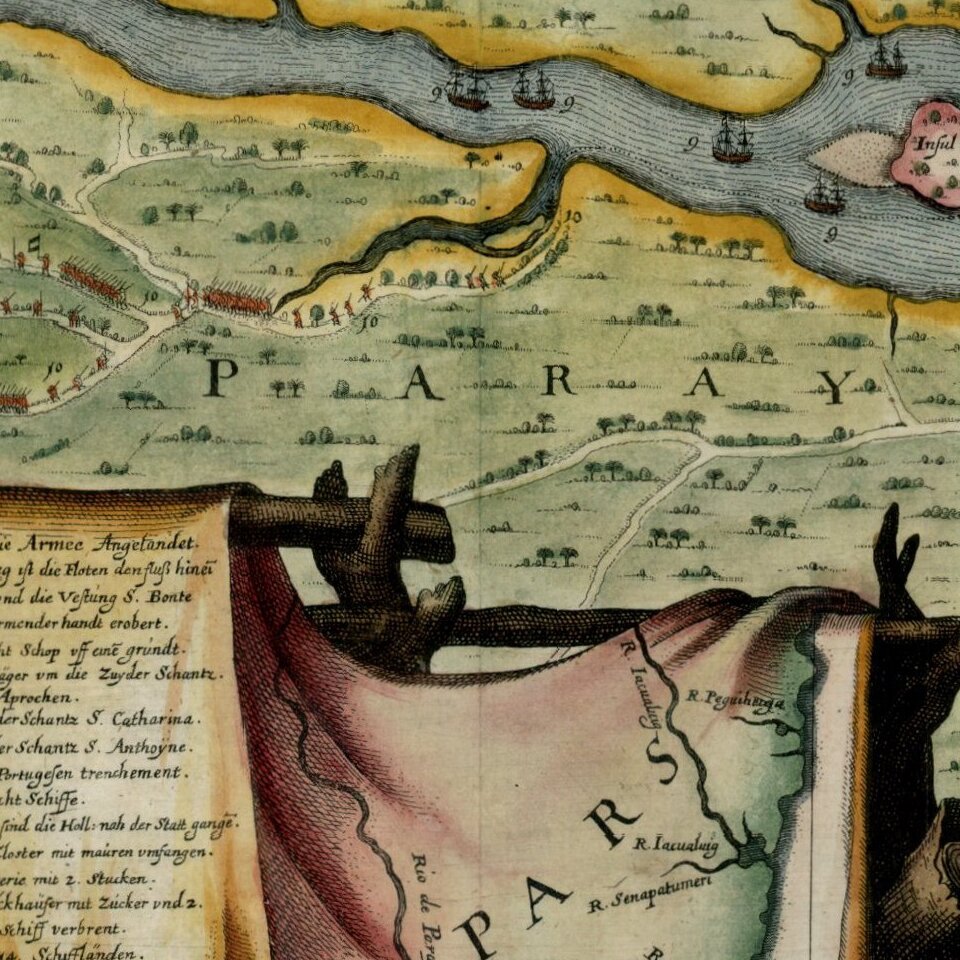 Nice full color example of Merian's scare regional map of the area around Paraiba, Brazil, with a larger regional map showing the Captaincy of Brasilia.