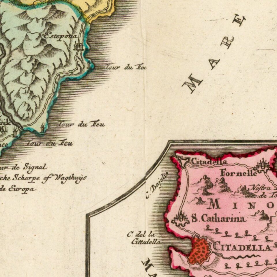 Decorative regional map of the southern parts of Spain, with large inset maps of Minorca, Ceuta, Cadiz, Gibralter and Malaga.